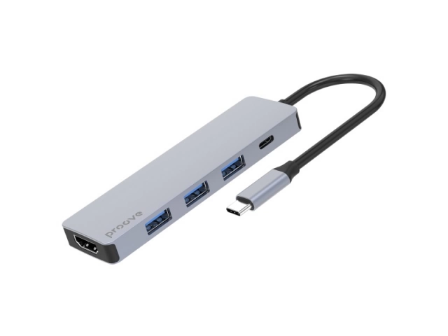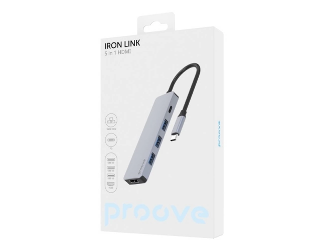 El Proove Iron Link 5 en 1 es un dispositivo completo con tres puertos USB 3.0 para una rápida transmisión de datos, un conector Tipo C para una carga PD3.0 eficiente y un puerto HDMI para una transferencia de imágenes de alta calidad.