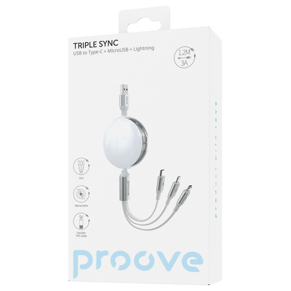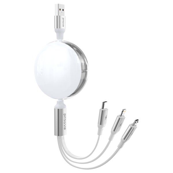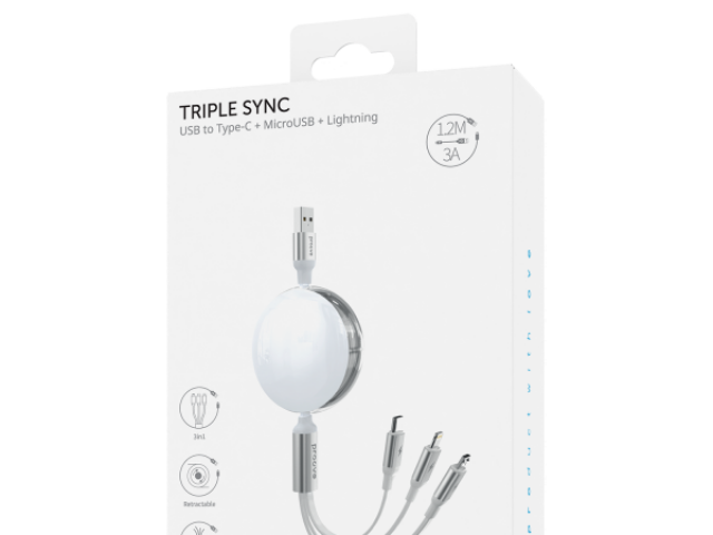 Es un cable multifuncional 3 en 1 que combina USB, Tipo-C, MicroUSB y Lightning. Ofrece hasta 3 A de potencia de carga y es ideal para usar varios dispositivos simultáneamente.
