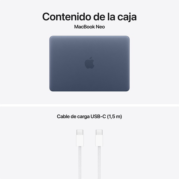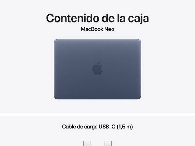 Chip Apple A18 Pro CPU 6 núcleos GPU 5 núcleos Neural Engine 16 núcleos Ancho de banda de memoria 60 GB/s Memoria RAM 8 GB Almacenamiento SSD 256 GB Pantalla Liquid Retina 13 pulgadas Resolución nativa 2408 x 1506 Brillo 500 nits Cámara FaceTime HD 1080p Teclado Magic Keyboard Audio Espacial con Dolby Atmos Sistema de dos micrófonos beamforming Puerto USB 3 USB-C Puerto USB 2 USB-C Entrada de 3.5 mm para audífonos Wi-Fi 6E Bluetooth 6.0 Batería de iones de litio 36.5 Wh Autonomía hasta 16 horas de video Peso 1.23 kg Sistema operativo macOS