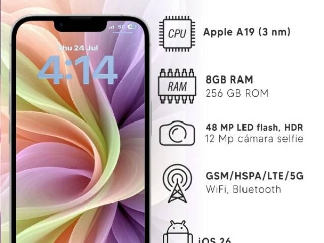 La combinación perfecta de tecnología avanzada y portabilidad. Con el nuevo chip A19, el dispositivo está optimizado para Apple Intelligence, permitiendo una interacción más inteligente y fluida en todas tus aplicaciones. Su pantalla de 6.1 pulgadas con Ceramic Shield 2 es tres veces más resistente ...